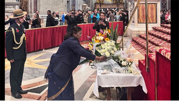 পোপ ফ্রান্সিসের রাষ্ট্রীয় অন্ত্যেষ্টিক্রিয়ায় অংশ নিতে ভ্যাটিকান সিটিতে থাকা রাষ্ট্রপতি দ্রৌপদী মুর্মু শুক্রবার প্রয়াত পোপকে শ্রদ্ধা জানান।