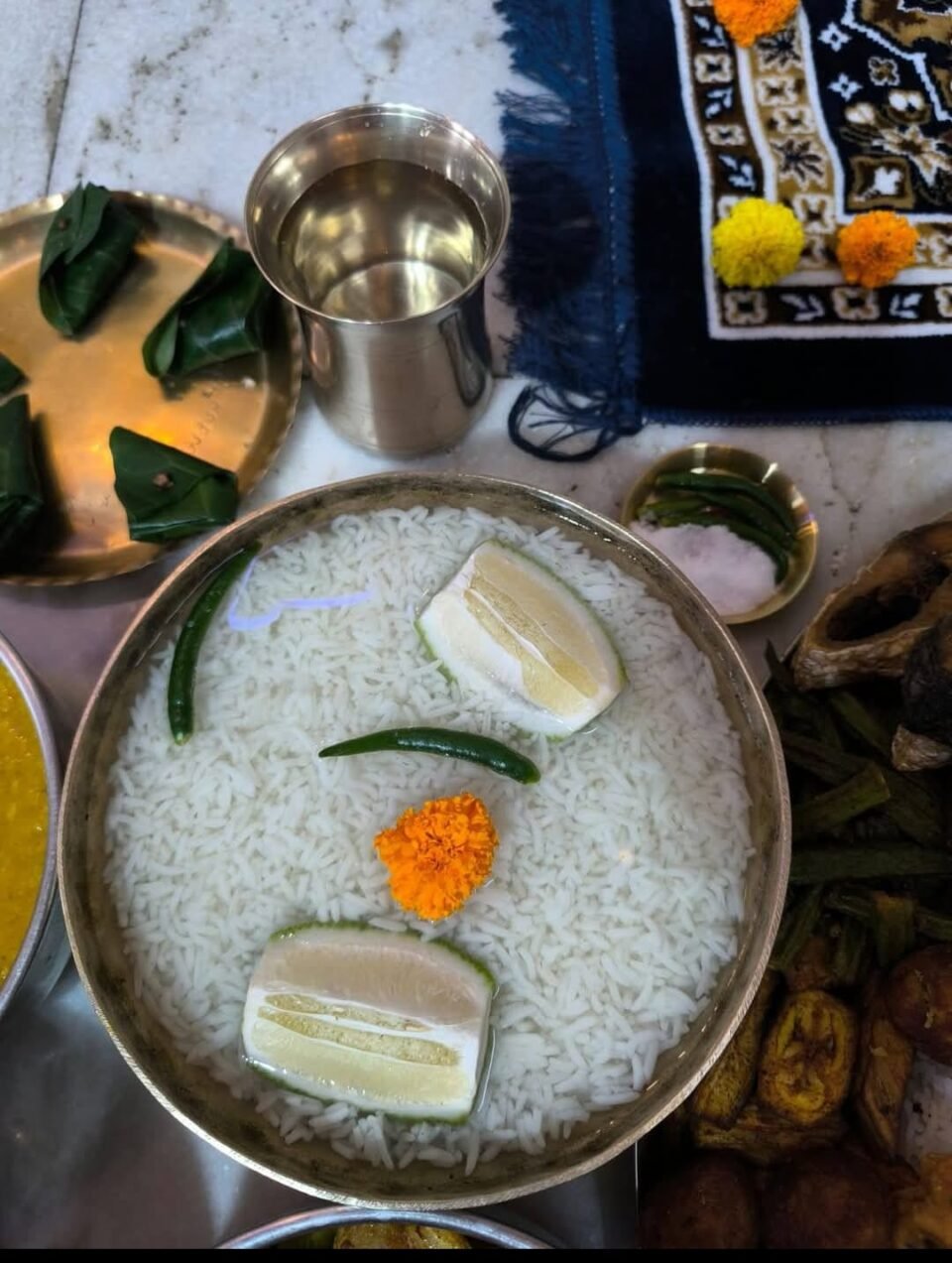স্বামী পরমাত্মানন্দ ভৈরব বললেন, “অরন্ধন মানে, যে দিন রন্ধন হয় না। আগের রাতে রান্না হয় যা কিছু, পরদিন তা-ই হয় দেবীর উদ্দেশে নিবেদন।” কথাটা শুনতে সহজ, অথচ এর ভিতর লুকিয়ে আছে আদি বাংলার হাজার বছরের সংসার-সংস্কৃতি।