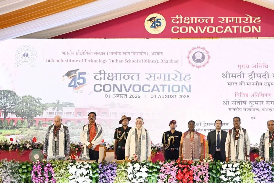 শুক্রবার ধানবাদে ইন্ডিয়ান ইনস্টিটিউট অফ টেকনোলজির (ইন্ডিয়ান স্কুল অফ মাইন্স) 45 তম সমাবর্তন অনুষ্ঠানে রাষ্ট্রপতি দ্রৌপদী মুর্মু শিক্ষার্থীদের জনগণের কল্যাণে তাদের শিক্ষাকে কাজে লাগানোর আহ্বান জানান, টেকসই উন্নয়ন ও অন্তর্ভুক্তিমূলক বৃদ্ধির গুরুত্বের উপর জোর দেন এবং জাতীয় চ্যালেঞ্জ মোকাবেলায় প্রযুক্তিগত প্রতিষ্ঠানের ক্রমবর্ধমান ভূমিকা তুলে ধরেন। ঝাড়খণ্ডের রাজ্যপাল সন্তোষ কুমার গাঙ্গোয়ারও অনুষ্ঠানে বক্তব্য রাখেন।