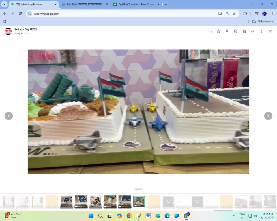 এই উত্তপ্ত পরিস্থিতির মধ্যেই কলকাতার এন্টালি মার্কেটের স্থানীয় বেকাররা ভারতের বিমান-প্রতিরক্ষা ব্যবস্থাকে সম্মান জানিয়ে দুটি বিশেষ থিমযুক্ত কেক তৈরি করেছে। “টেস্ট অ্যান্ড বাইট” নামের একটি কেকের দোকান “সুদর্শন মিসাইল”-আকৃতির কেক এবং “অপারেশন সিন্দূর”-এর আদলে মিসাইল-সজ্জিত কেক বিক্রি করছে, যার দাম প্রায় ৮,০০০ টাকা। দোকানের মালিক জানান, “এটি বিক্রির জন্য নয়, বরং আমাদের সশস্ত্র বাহিনীর প্রতি শ্রদ্ধাঞ্জলি।”