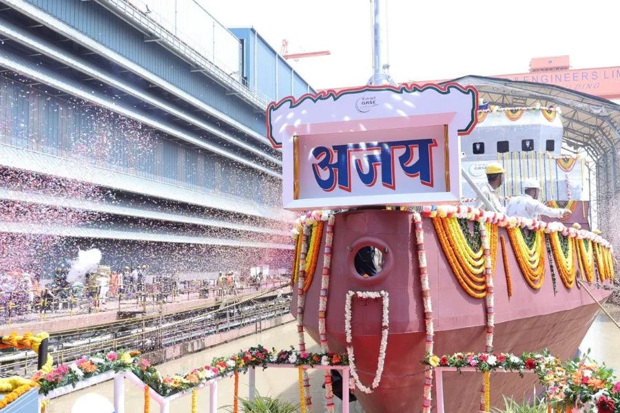ভারতীয় নৌবাহিনী সোমবার কলকাতার গার্ডেন রিচ শিপবিল্ডার্স অ্যান্ড ইঞ্জিনিয়ার্স (জিআরএসই)-এ অ্যান্টি-সাবমেরিন ওয়ারফেয়ার শালো ওয়াটার ক্র্যাফট (এএসডাব্লু এসডাব্লুসি)-এর অষ্টম এবং শেষ জাহাজ ইয়ার্ড 3034, অজয় চালু করেছে।